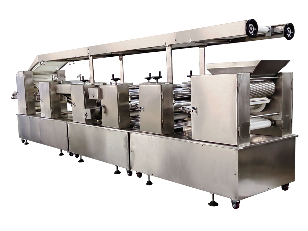 制皮機為臥式成型機,通過傳送機構(gòu)將各道軋輥線速度比合理分配,實現(xiàn)從投料到制皮成型自動化生產(chǎn)。適用于餃子皮、餛飩皮、燒麥皮、蒸餃皮、以及燙面類面皮成型。